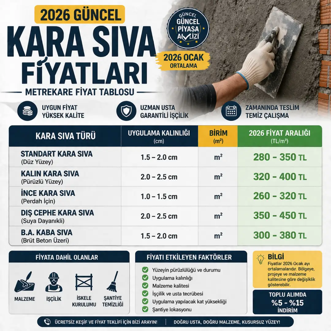Kara sıva metrekare fiyatları; uygulanacak yüzeyin durumu, sıva kalınlığı, işçilik kalitesi ve proje büyüklüğüne göre değişiklik gösterir. 2026 yılı itibarıyla Türkiye genelinde ortalama kara sıva fiyatları aşağıdaki aralıklardadır: